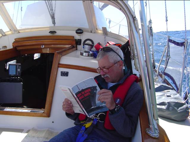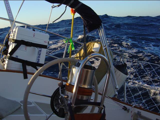 Dawn of the first morning at sea was perhaps the most challenging as waves built to a frightening height and we suffered a couple of boardings that filled the cockpit and dampened our spirits. The odd thing was that the winds were modest [+/- 20 knots] as compared to the steep and imposing waves. Weather predictions had foretold of 15-20 knots of wind and up to six foot seas; clearly this was not what we experienced. Something else—a storm north of us perhaps—was affecting the seas around us.