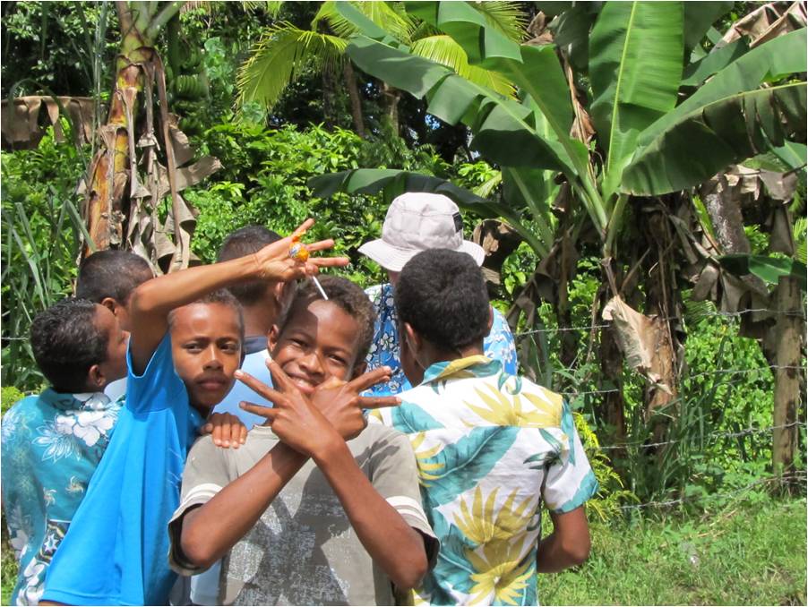 Philip clowns it up by pretending to take a bite out of a cassava leaf. The trees are ubiquitous throughout Fiji and cassava is a staple food. |