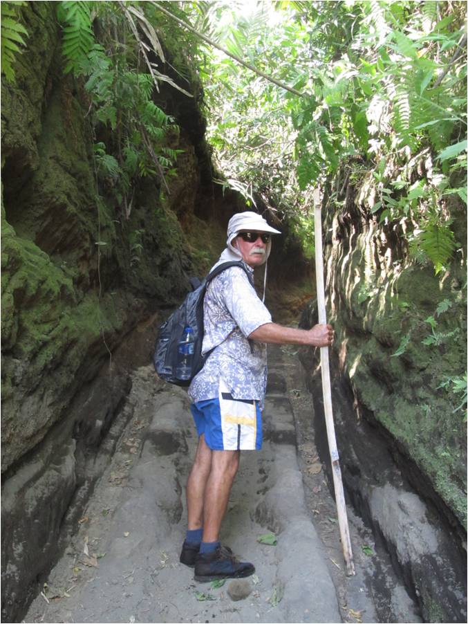 This trail cut deeply into the volcanic fine, gritty soil close to the river. There were deep ruts made by an oxcart which is used to haul out the copra crop. |