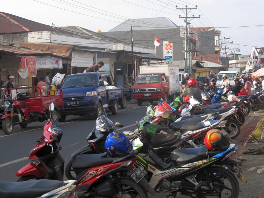 of Tobelo is chaotic with a cacaphony of loud music blasting from the mikrolets (a type of van taxi), people yelling, and horns continuosly blasting from trucks, motorcycles, motorscooters, and cars. Plus, they drive on the wrong side of the road. |