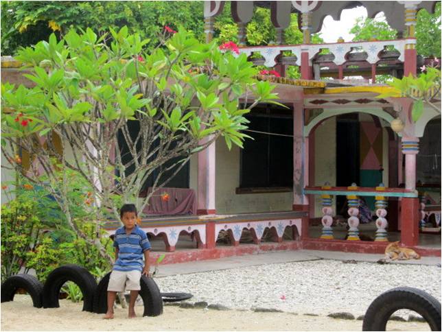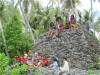 we go, with about 15 munchkins in tow. After church we planned a hike to the end of the motu where a statue of Jesus Christ sits on a pedestal. Even "monkey", a tiny tot, joined in. |