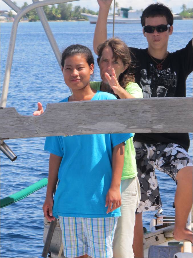 Friends Rebecca and Patrick had spent well over six months in Majuro replacing their mast that they lost 500 miles south in Kiribati. This was the day they finally sailed out...you can see the joy on their faces as they pull away west towards the pass. |