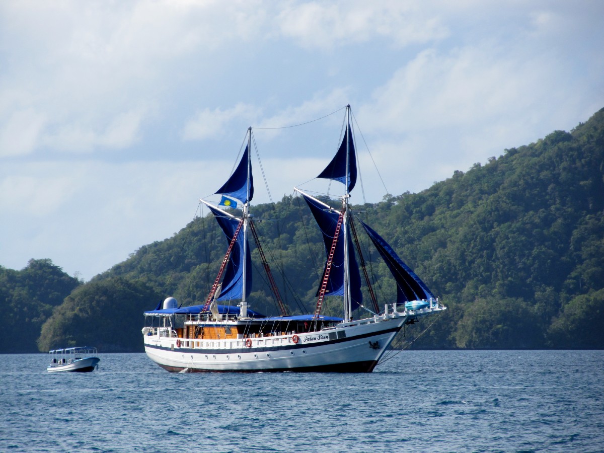 have the option of staying aboard one of the lovely liveaboard yachts. This is the Palau Siren on a rare day of actually sailing. |
