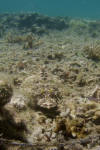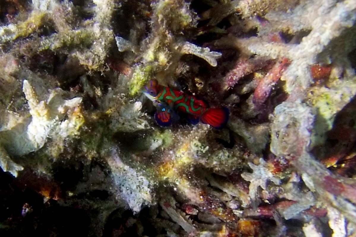 much scarier than he was...at least to us. We don't know what he preyed on, but probably the beautiful mandarinfish whose coral rubble he laid in. |