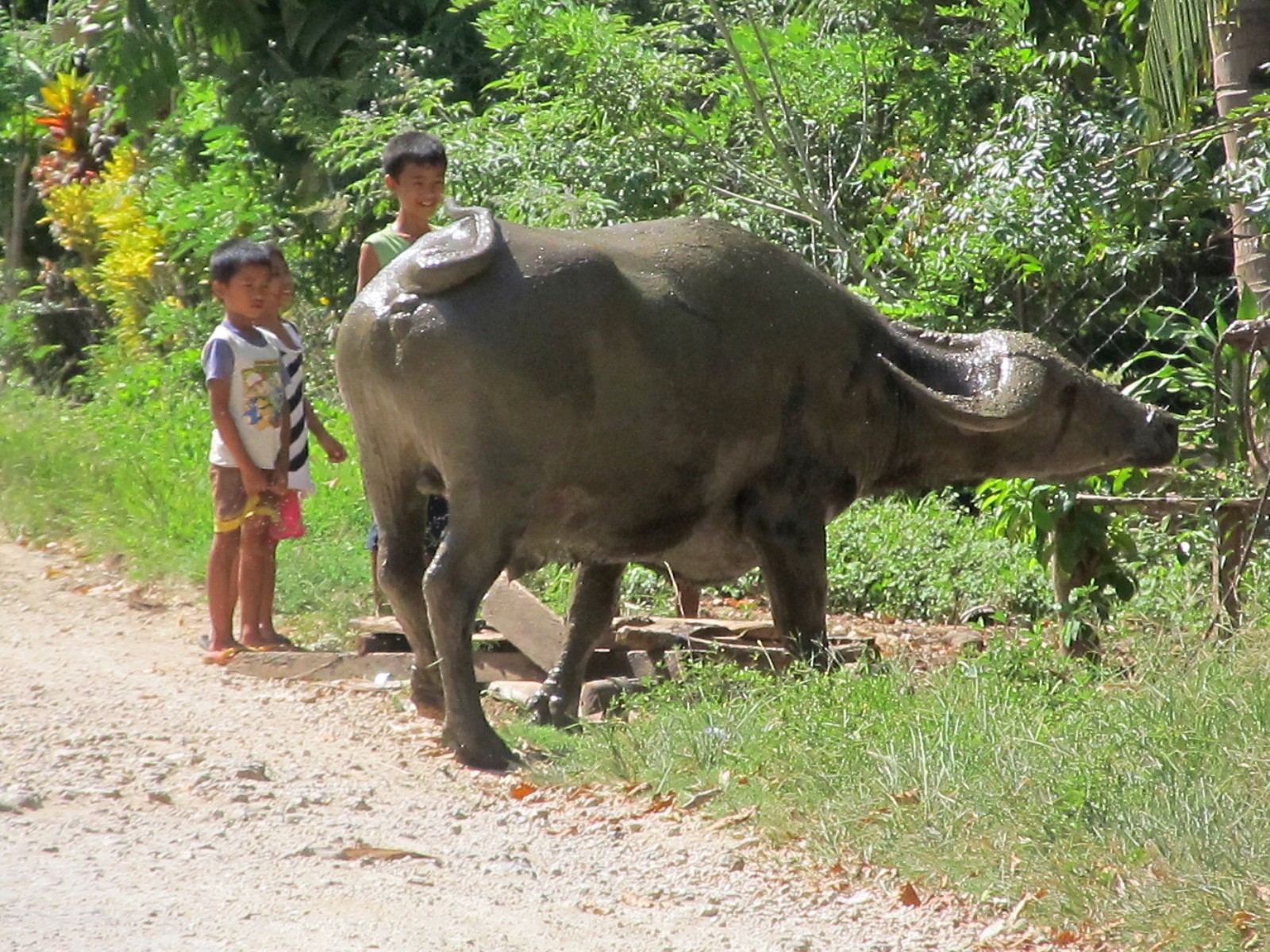 Are the national animal of the Philippines. These gentle giants seem to serenely amble through their burdens. These children had been riding on a sled towed behind before the line to the yoke broke. |