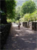 Lesie is dwarfed by tall coconut trees that line this path along the sea. |