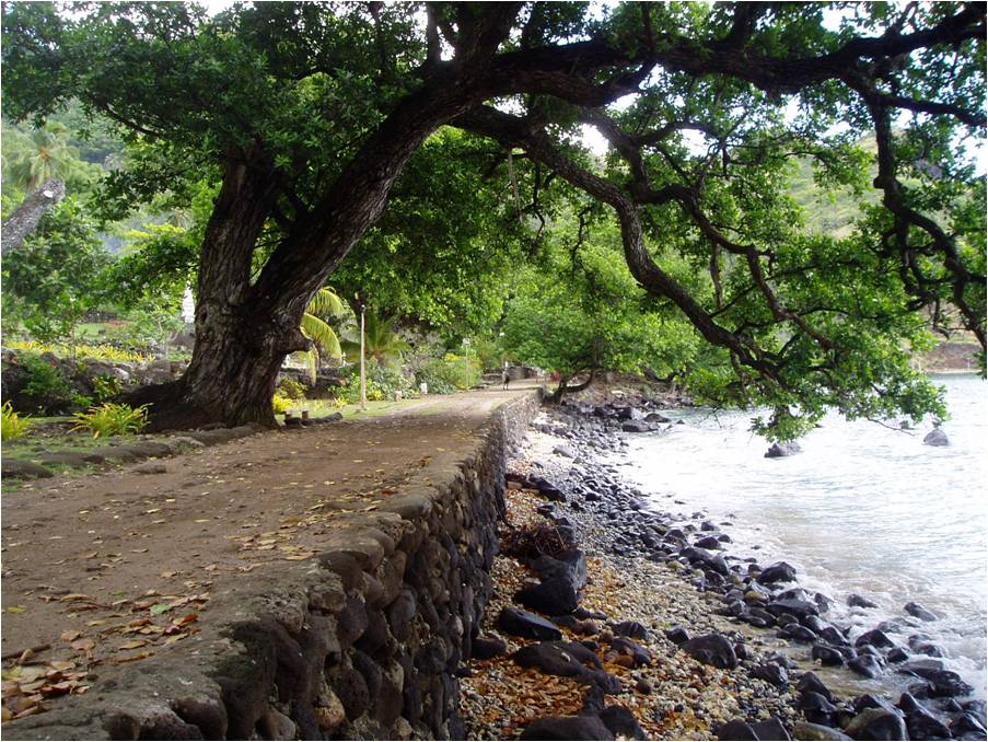 The shady road at Hapatoni nearby to gently lapping waves is relaxing. The townspeople have built small benches all along the edge of the sea to allow for lingering. |