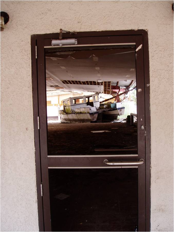 This relatively large fishing boat was swept up by the tsunami waves and driven through the side of the Community Center building, coming to rest inside the building. |