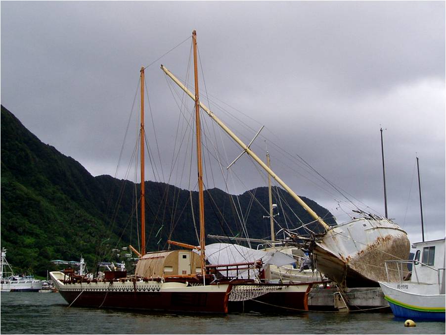 The Aussie yacht Biscayne Bay broke free from the pier at Pago Pago and was severely damaged in the tsunami of Sept. 29, 2009. Waters rose 25 or more feet and relocated boats, cars, containers, etc. |