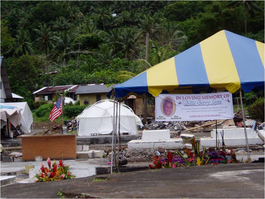 This memorial was set up (probably by relatives) for one of the victims of the tsunami. The memorial is nearly at the end of the bay where the most destruction occurred. The dome tent is an example of the tents provided by FEMA which began to appear two weeks after the disaster. |