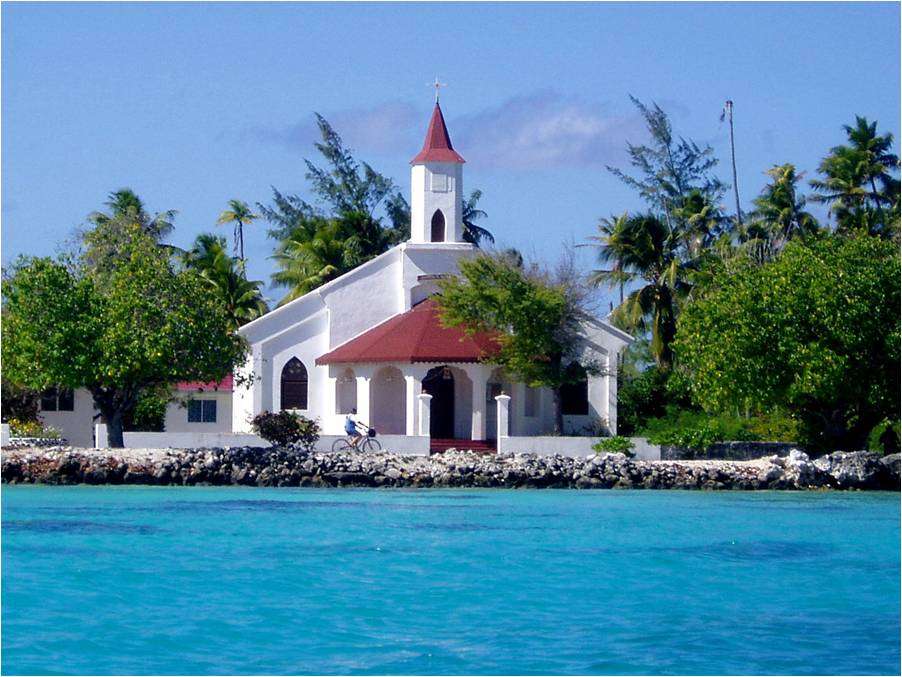 The simple church at Tetamanu has no gold leaf adorning it's altar, but mother of pearl from the abundant oysters of the motus waters. |