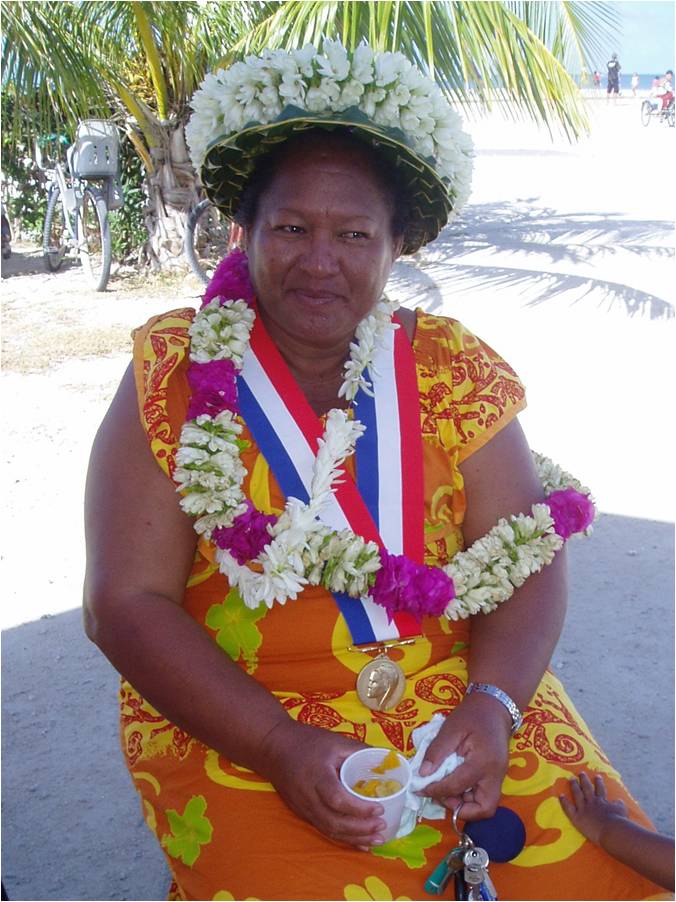 In front of the municipal building, flags of France, French Polynesia and the Tuamotus flapped in the stiff breeze. |