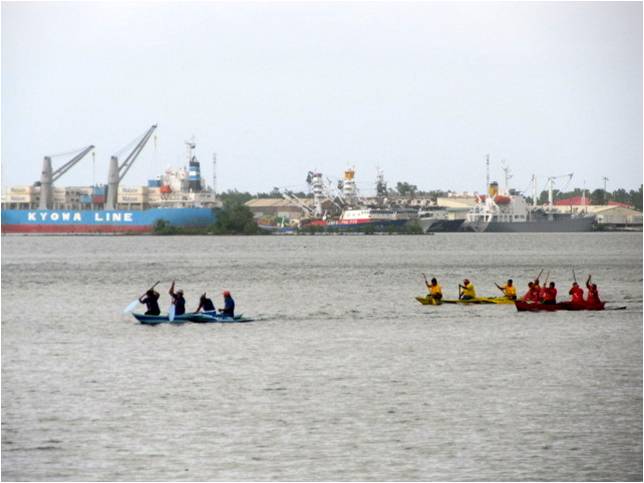 whose 'burb is the east side of Sokehs Island, had been training for canoe races for months. Here their neighbors from the Kapingamarangi 'burb watch the races while tied off to Carina's stern. |