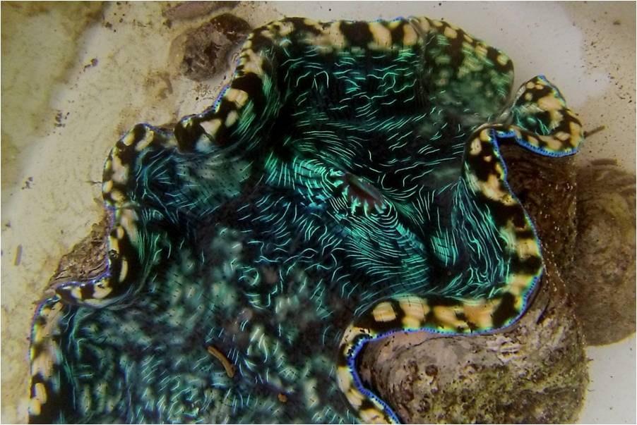 of the Pacific are magnificent. This clam from Palau and living in a giant clam hatchery in Yap was just bigger than an American football and was being used as breeding stock. |