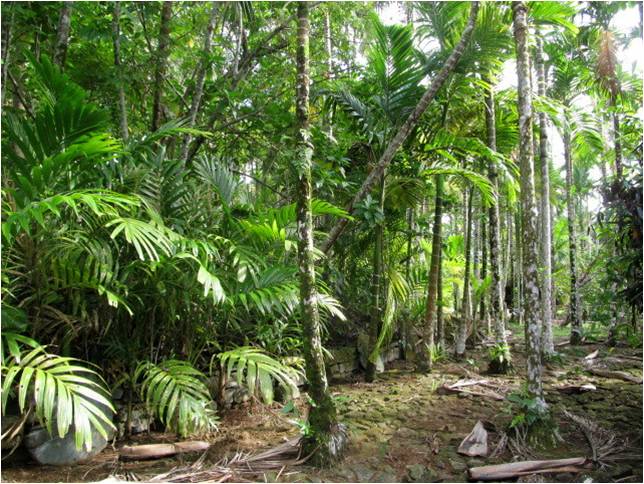 this one on the south end of the island where the land seemed supersaturated with brackish water. Betel nut trees flourish in these environments. |