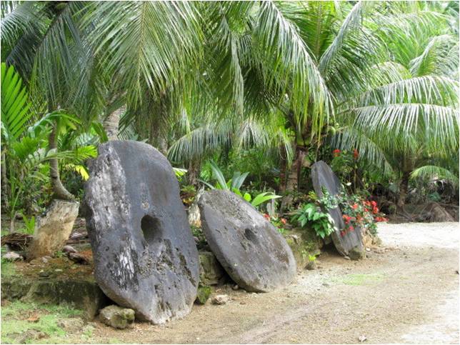 stone paths and stone money everywhere but also stone platforms with small vertical rocks around the perimeter. These platforms kept the men off the (often swampy) ground while the rocks served as backrests. |