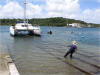 haul out on the slipway in Yap coincided with a rare west wind, beam to the hull. The haulout took many hands including Alfredo who was trying to keep the bow straight. |